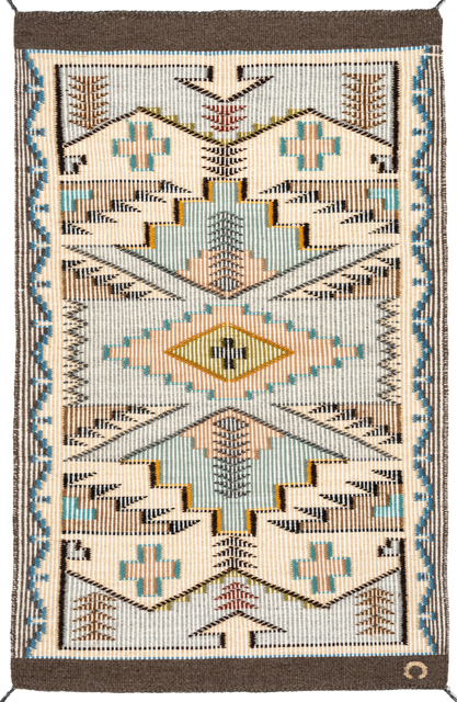 My late mother taught me mainly to respect our weaving and ourselves. At a very young age my mother instilled in me to live in gratitude as a weaver. Weaving is our legacy and personal identity as Dine’. When I weave I prepare my loom with only prayers. I spin my own yarn and use plant dyes that I have collected in the fall when it is ripe with color such as wild carrot root, sage, wild tea and black walnuts. I collect the plants on the homeland and travel for some of the plants.