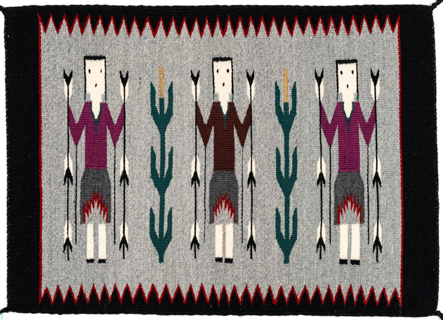 My mother taught me how to weave. I get my ideas for my designs from traveling through places, different rug designs and putting designs together. Certain designs are only woven certain times of the year. When weaving, I think positive. I prefer weaving Yei, Pictorial & my own designs in earth tone colors (brown, white, maroon) because it makes good earth or natural color designs. I weave 10 hours each day year-round and can weave 8 or more rugs a year depending on the size. I weave a spirit line or pathway out that people can see in my rugs.