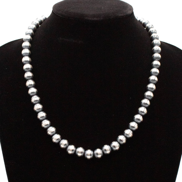 Navajo pearls are handmade sterling silver beads, traditionally created by Navajo artisans, each bead is individually handcrafted, which results in unique pieces. They are crafted by shaping two silver discs into a bead, soldering them together, and then finishing them, which can include polishing for a bright shine or oxidizing for a dark, matte finish. Navajo Pearls are often strung into necklaces or bracelets, come in various sizes and shapes and can feature decorative stamped or fluted designs.